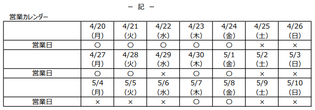 【期間中4/30(木)、5/1(金)、5/7(木)、5/8(金)は営業日となります】